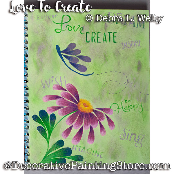 Two new designs for your journaling. Or just paint them on a canvas. Ocean Life is created with a DecoArt stencil and rhinestones. Love to Create is a pretty flower and butterfly design utilizing comma strokes. Both have soft variegated backgrounds.