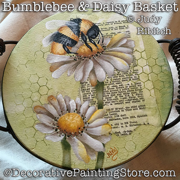 Pretty design of daisies and a large bumblebee on basket lid or your choice of surface includes some mixed media elements of book page background and chicken wire stenciling.