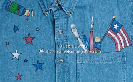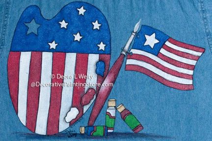 Americana artist design with flag palette, brush flag pole, bottles of paint, stars... painted on blue denim shirt, but could be easily adapted to other surfaces such as a fabric tote, sweatshirt, suitcase, brush holder, etc.