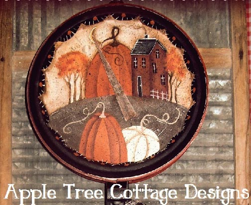 Saltbox houses and giant pumpkins in the autumn moonlight...  Martha painted this design on an old hanging shop scale. You might want to choose an old clock, bread board or any other treasure you might find! It would also work well on a door crown or screen.