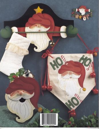 Very cute beginner projects for Christmas, winter, and everyday - nativity tree skirt and banner, animal ornaments on dowel tree, teddy bear with changeable clothes for the holidays, Christmas stockings, kiss the cook teddy bear on apron - recipe folder - plaque, Santa and reindeer, Santa on birdhouse - towel bar - canvas banner.