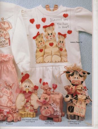 Cute whimsical projects on wood, soft sculpture fabric, and molded Sculpey clay - piggies, cows, cats, chickens, bunnies.